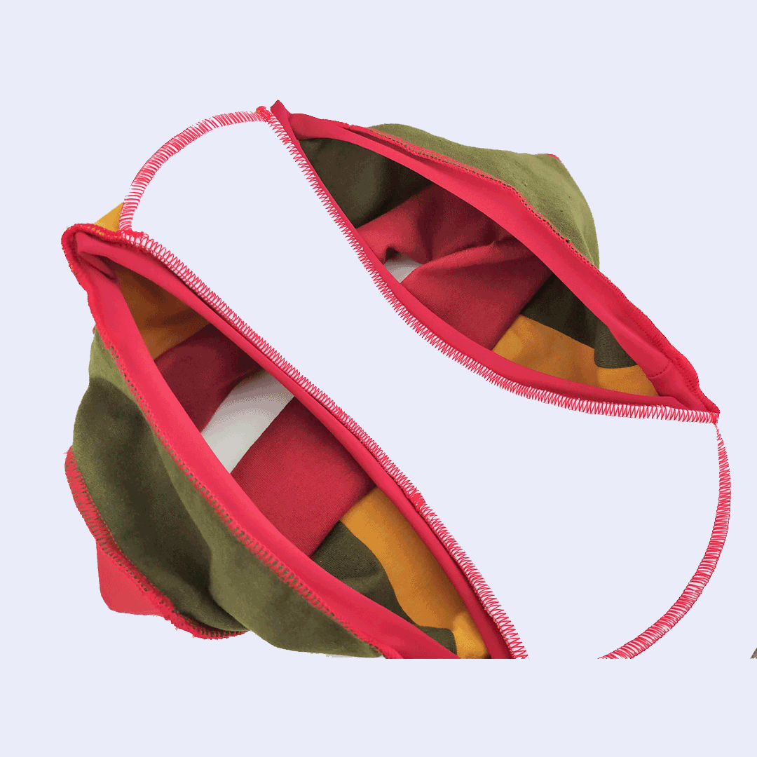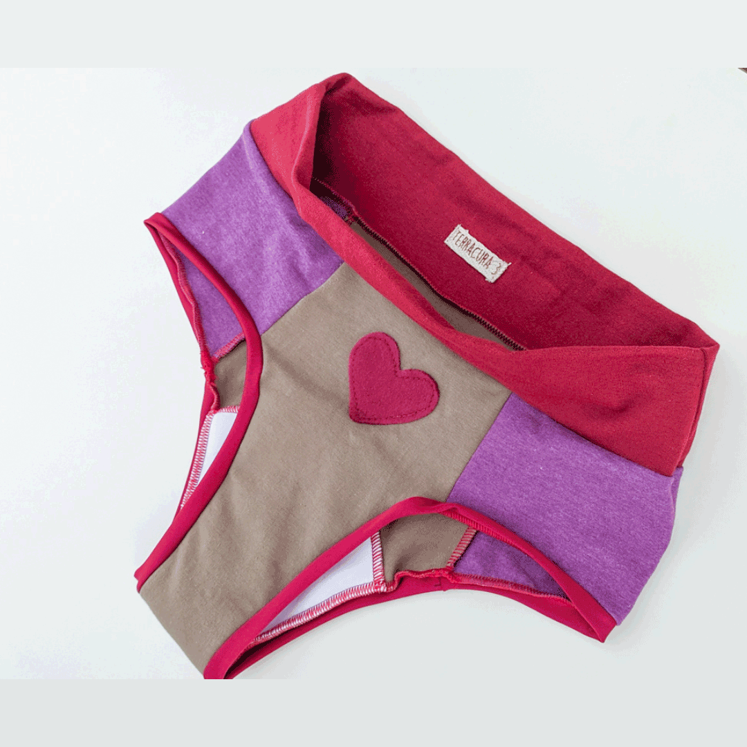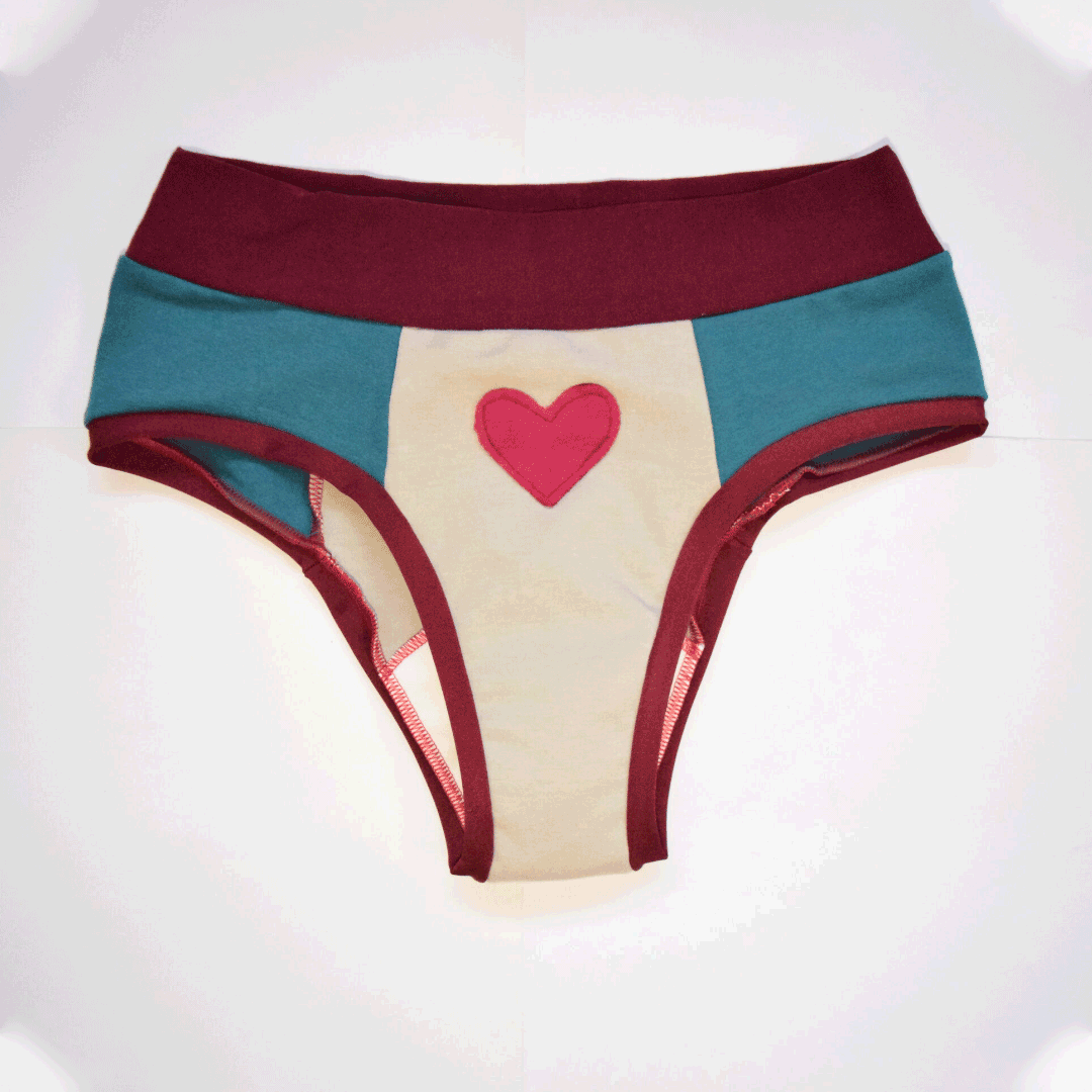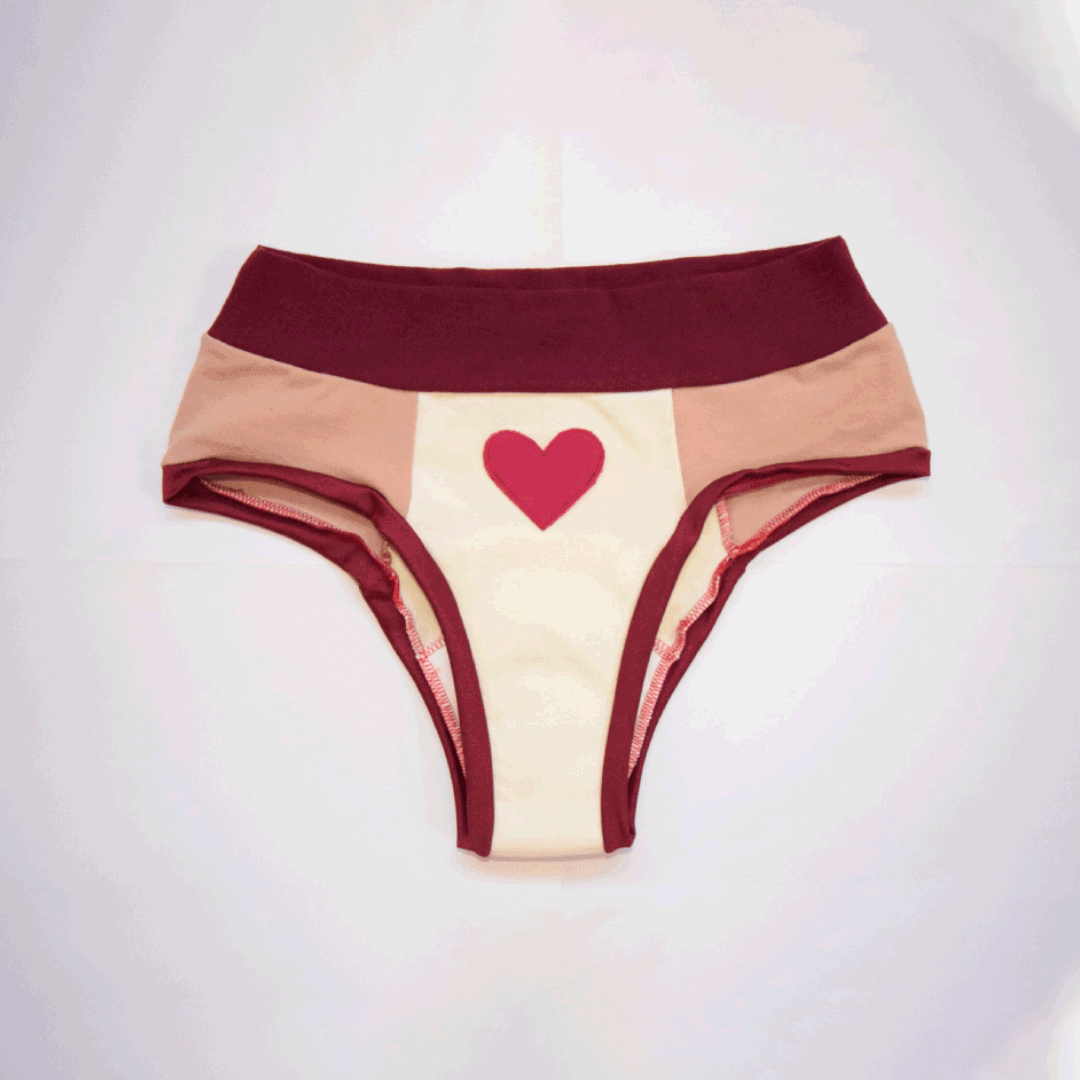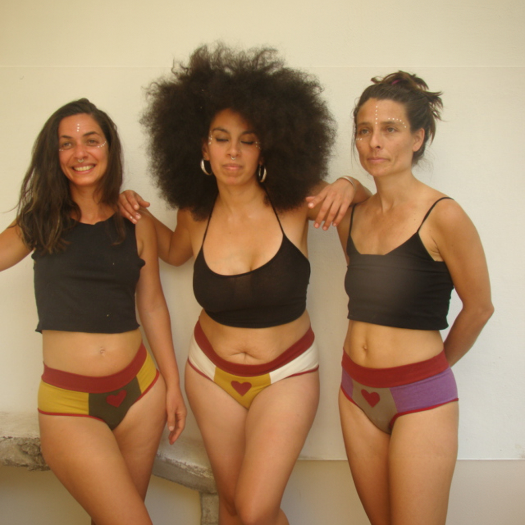 El modelo de bombachas elegido tiene la cintura más alta para mantener el útero contenido durante el ciclo, lo que ayuda a aliviar los cólicos. La idea es ayudarte a sentirte segura y cómoda en ese momento tan especial. Las bombachas están cosidas con hilos rojos para recordarnos la importancia de la sangre cíclica, que pulsa vida, un símbolo de fertilidad dentro y fuera de nuestro cuerpo. La parte interior de las bombachas es intencionalmente blanca para facilitar la relación con la sangre menstrual, con el flujo, lo que permite controlar el color y la textura de la sangre y, en consecuencia, la observación de la salud íntima.